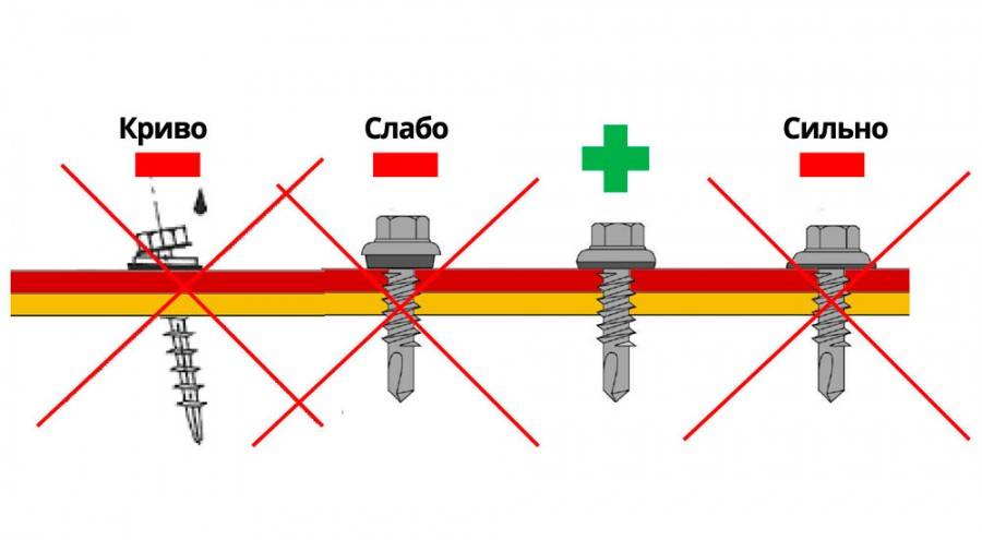 При устройстве кровли нужно отслеживать, чтобы было максимально плотное прилегание головки крепежа к закрепляемому покрытию. Шайба при этом не должна деформироваться.