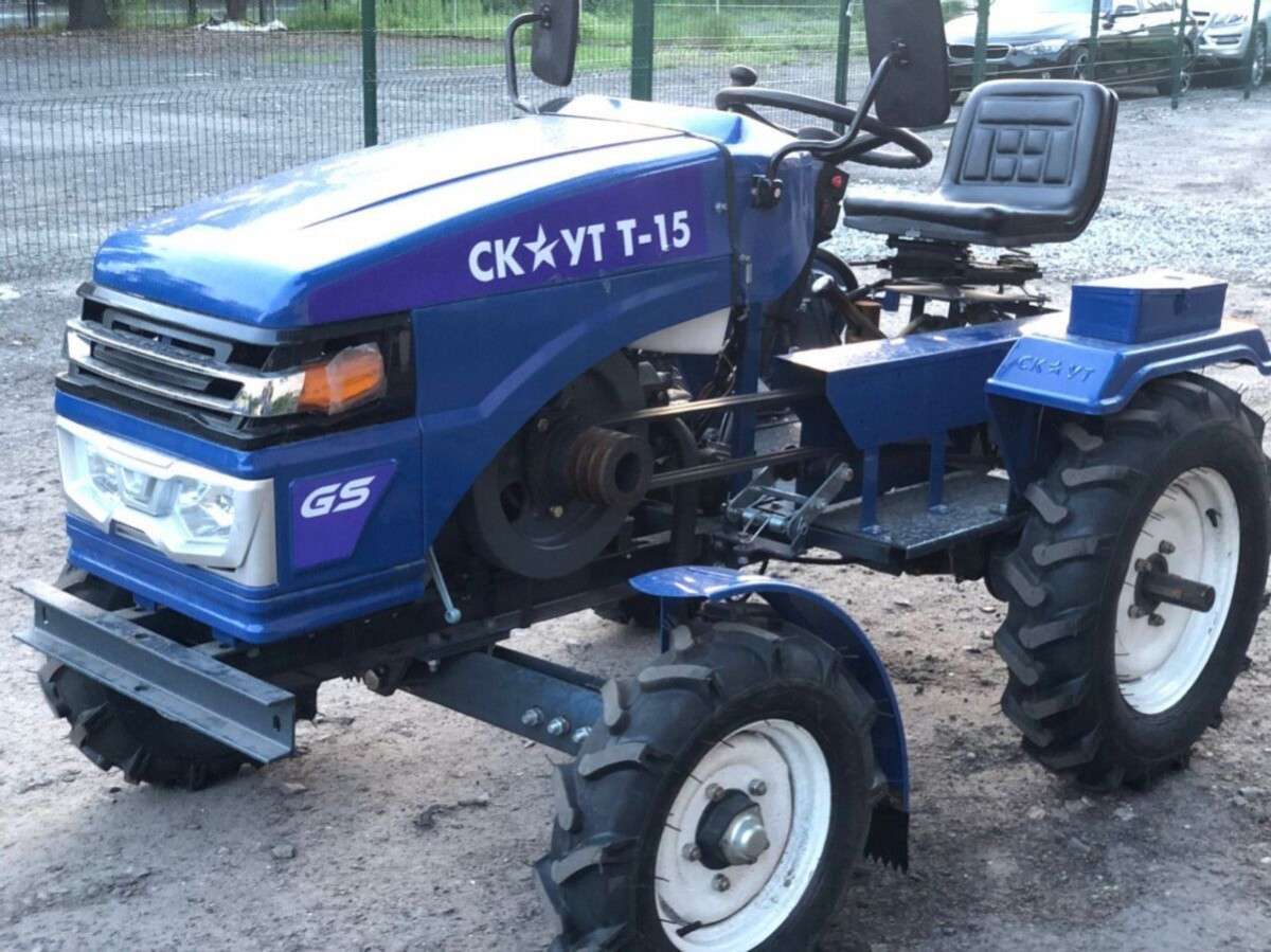 Одна из самых популярных садовых машин у землевладельцев — это «Скаут Т-15». Агрегат поддерживает порядок на участке: стрижет газон, сметает щеткой листья, убирает снегоуборщиком снег, а также пашет и обрабатывает почву, засаживает и выкапывает овощи. На машине установлен дизельный двигатель мощностью 14,85 лошадиных сил. Размеры машины составляют 241x135x119 см. С такими габаритами машина спокойно передвигается по участку, не задевая деревья и растения. Для кошения газона к машине подключается косилка. На выбор к агрегату можно подключить три разных косилки: заднюю роторную, переднюю роторную и переднюю сегментную. Выбор косилки остается за садоводом, а также типом газона, который растет на участке.