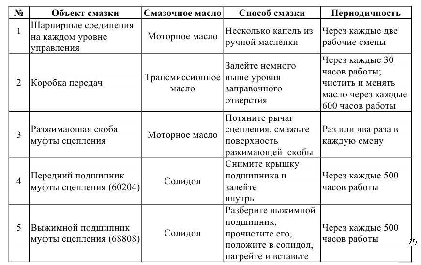- Смазка трущихся частей агрегата соответствующими маслами (указаны в инструкции).