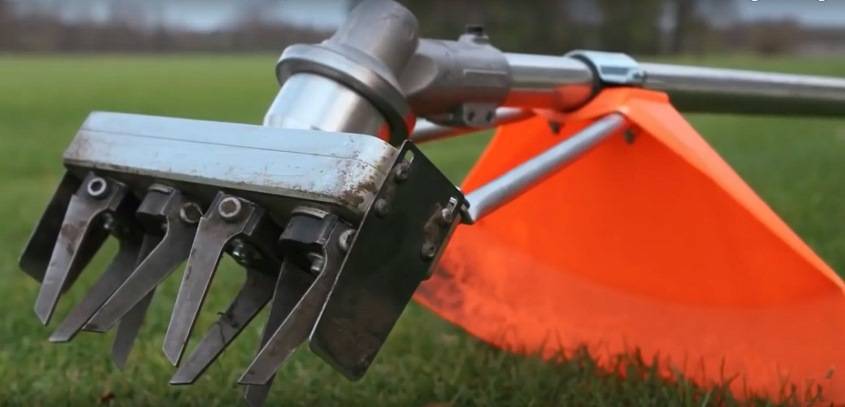 Роторный триммер имеет 4 сменные режущие головки, изготовленные из высокопрочной стали. Ширина зоны обработки составляет 200 мм.