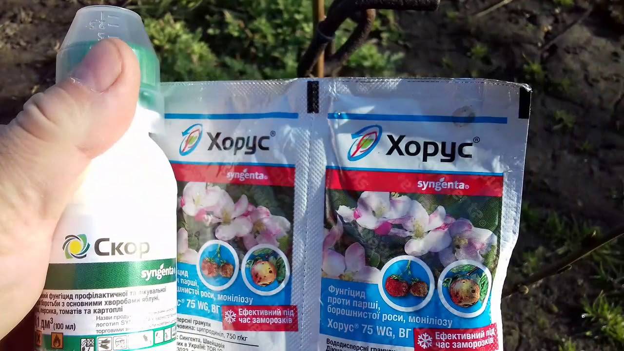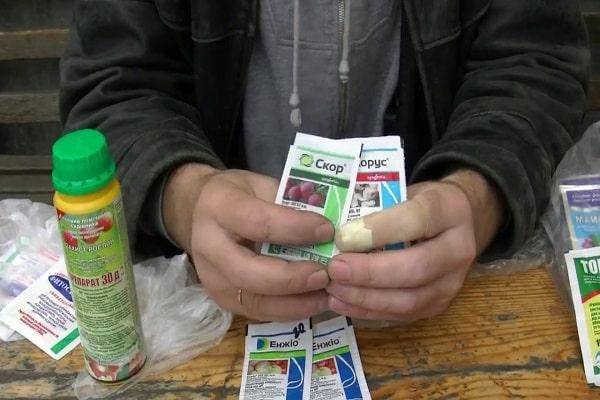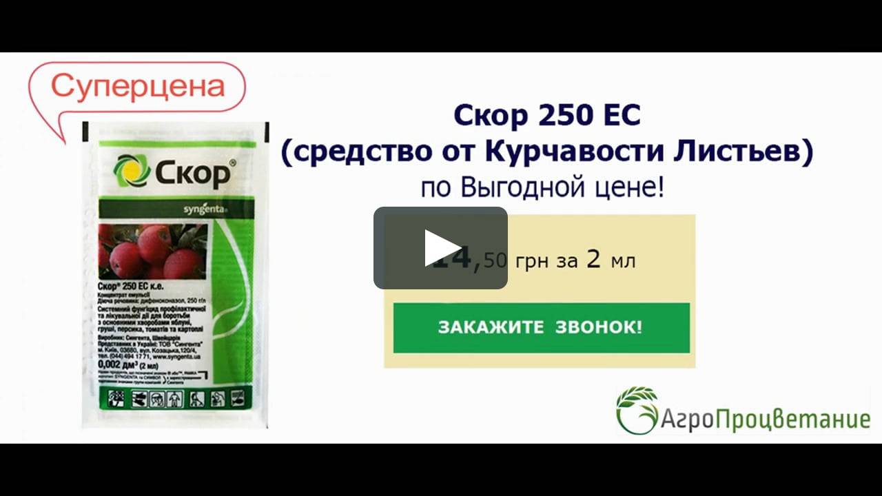 - Скор. Является быстродействующим фунгицидом. Для обработки препарат разводят с водой в количестве 2 мл средства на 8 литров воды.