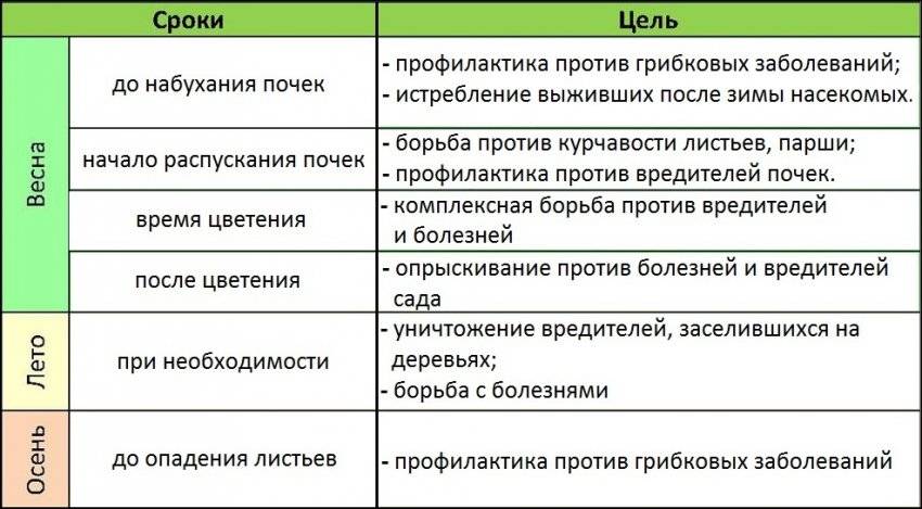 Плановые обработки нужно проводить ранней весной и осенью, когда листья уже опадут, деревья перейдут к спячке. В марте требуется выполнить первое опрыскивание после зимы, а затем смотреть по состоянию сада.