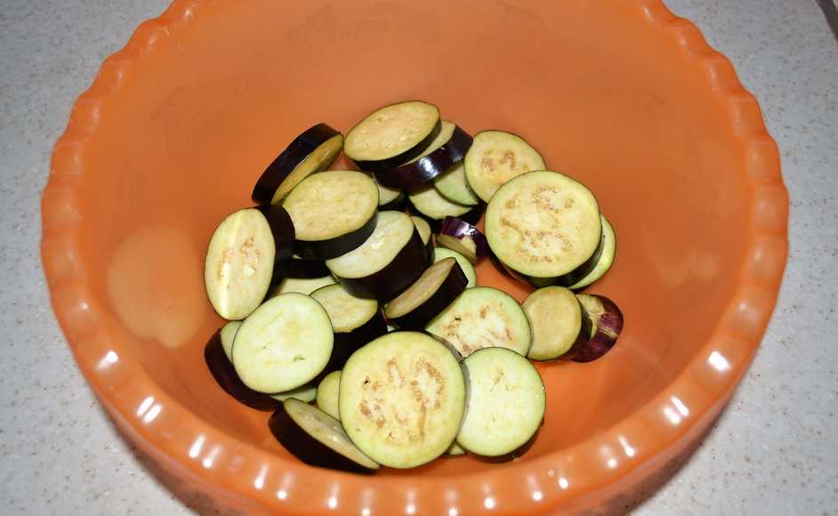 - Полученный раствор доводим до кипения и складываем в него мытые и очищенные от плодоножки баклажаны. Бланшируем их три минуты. Далее, для того что бы стекла лишняя жидкость, баклажаны охлаждаем и помещаем под гнёт.