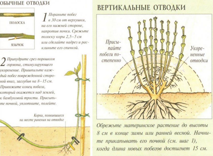 Для размножения отводками нужны однолетние побеги. Возле них выкапывается бороздка 15–20 см глубиной, куда укладывается побег и присыпается почвой. Сверху обильно орошается тёплой водой. Верхушку побега нужно подвязать к забитому подле колышку.