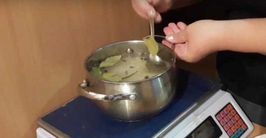 - Продукт укладывают в глубокую кастрюлю, добавляют уксус и пряности.