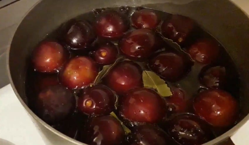 - Утром маринад сцеживают, кипятят и вновь заливают сливы.