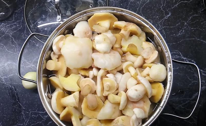 2. Когда они отварятся, опрокиньте их на дуршлаг и промойте проточной водой. Затем снова положите в кастрюлю и залейте чистой водой. Включите огонь и варите их после закипания еще 30 минут. Пену также снимайте. После варки грибы снова откиньте на дуршлаг и промойте холодной проточной водой.