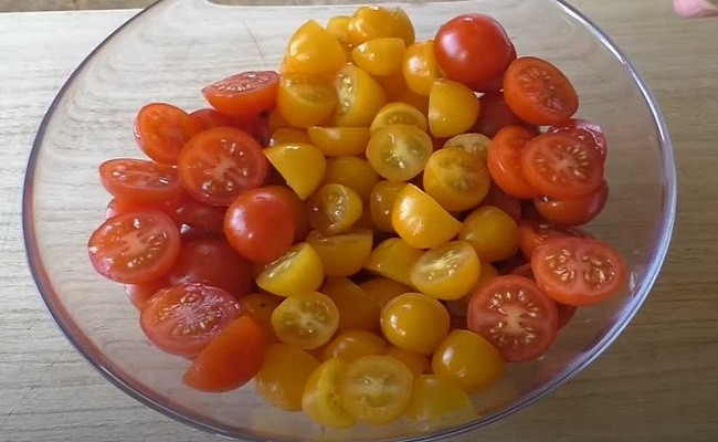 Мы взяли ассорти из томатов черри. Какая красота – и красные, и желтенькие. Вы же можете брать и любые другие сорта, если черри нет. Просто нарезать их придется помельче.