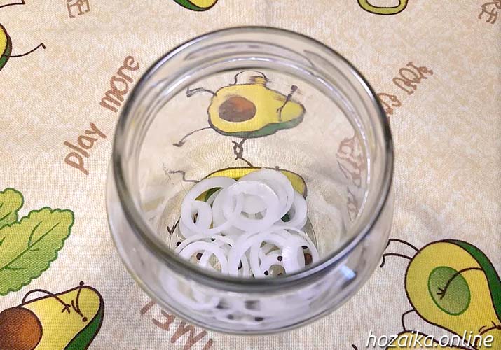 Возьмем небольшую луковицу, нарежем ее кольцами. Поместим на дно банки вместе с горошинами черного перца, в количестве 5-6 штук.