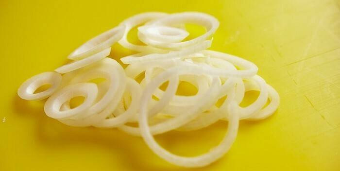 Лук очищаем от шелухи и нарезаем кружками.