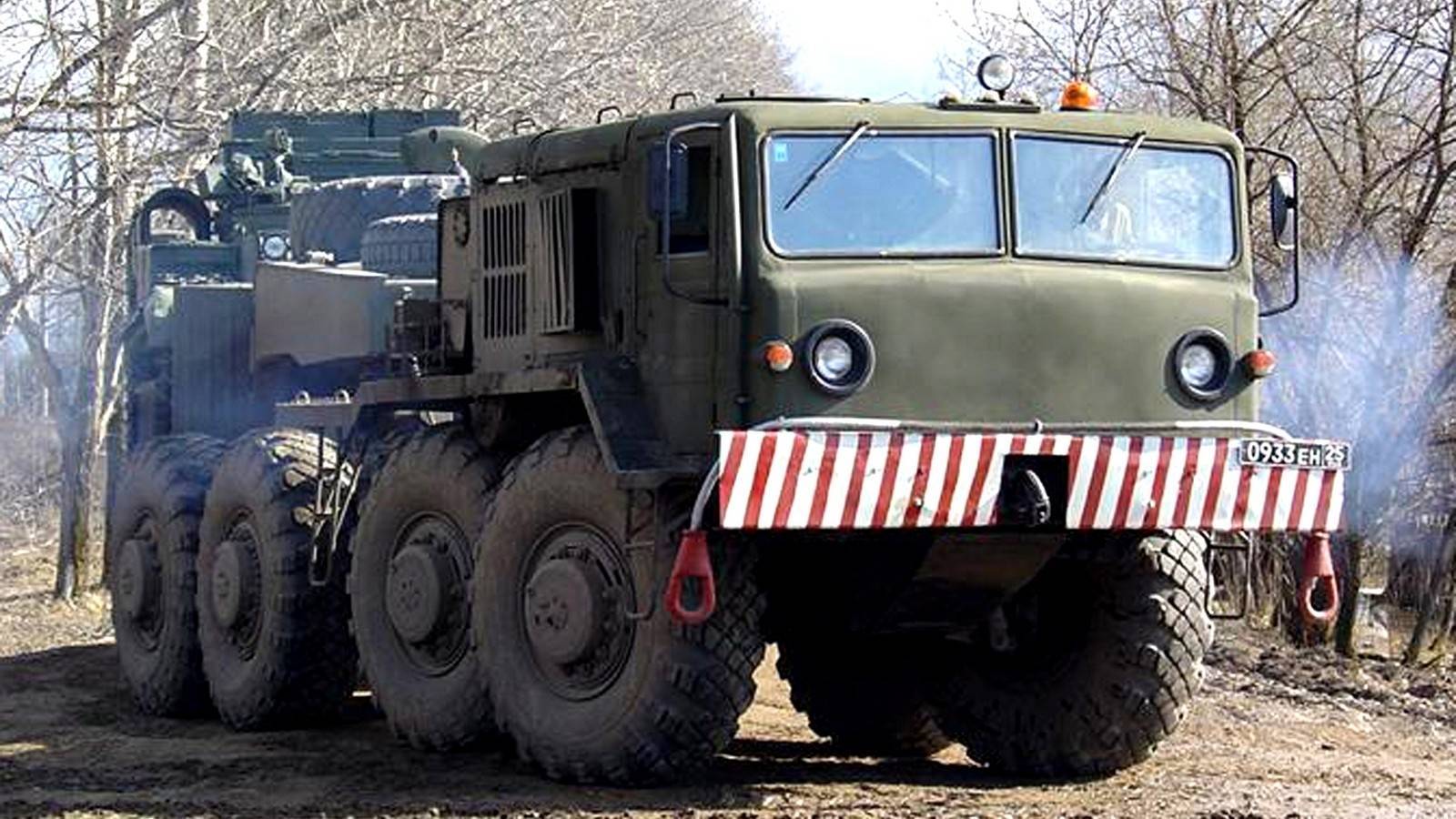 Выпускались также восьмиосные 80-тонные шасси МАЗ-7922 “Зубр” и МАЗ-7923 “Бизон”, оборудованные электромеханической трансмиссией и 800-сильным мотором ЯМЗ, причем полные технические характеристики этих махин до сей поры широкой публике неизвестны. Снаряженная масса такого тягача – 44 тонны, и груз он везет достойный – 80 тонн.