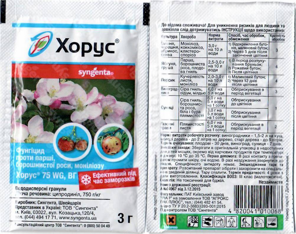 - Фунгицид Хорус. Применять его нужно, учитывая температурный режим: столбик термометра должен быть не ниже +5○ и не выше +22○.