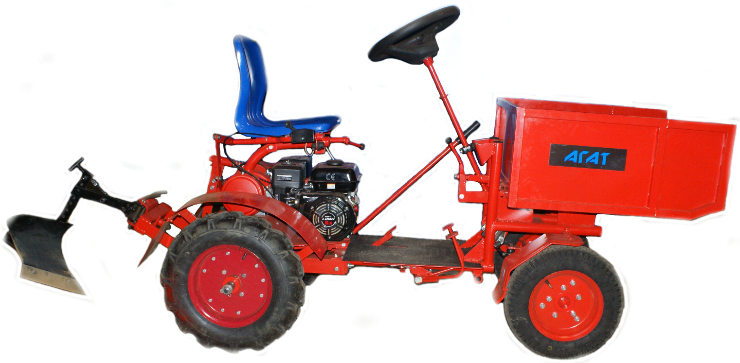 - В соответствии с производственной инструкцией мотоблока Агат на мини-тракторе среднего класса расположена базовая трансмиссия и регулируемый руль.