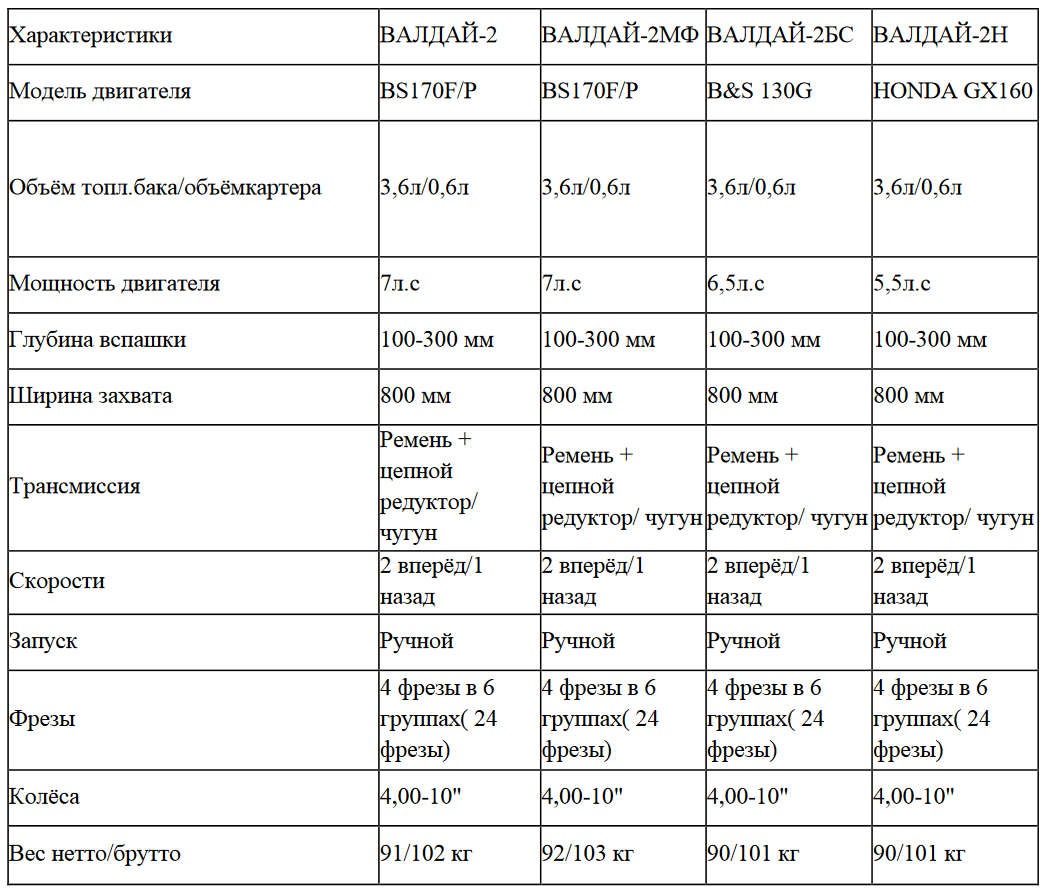 Предлагаем изучить таблицу характеристик, где представлены технические данные каждой из вышеперечисленных модификаций мотоблоков “Валдай” от “Редверг”: