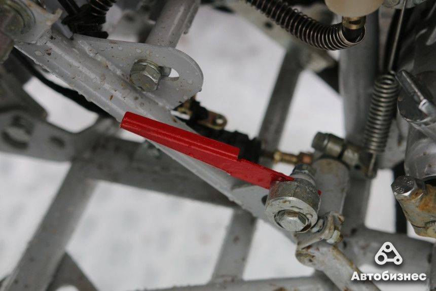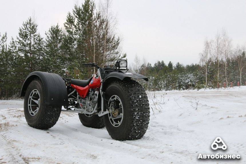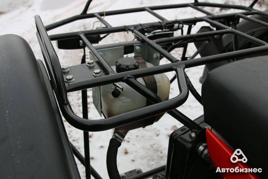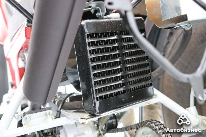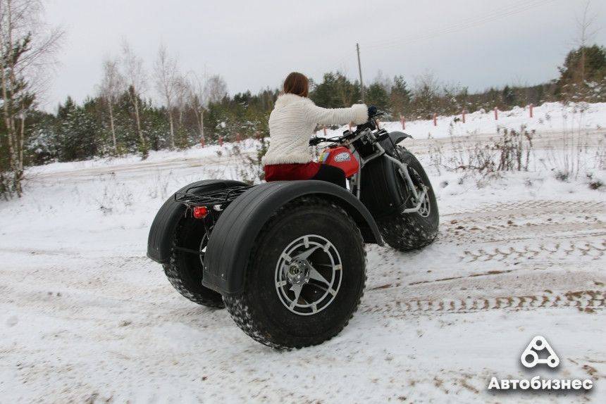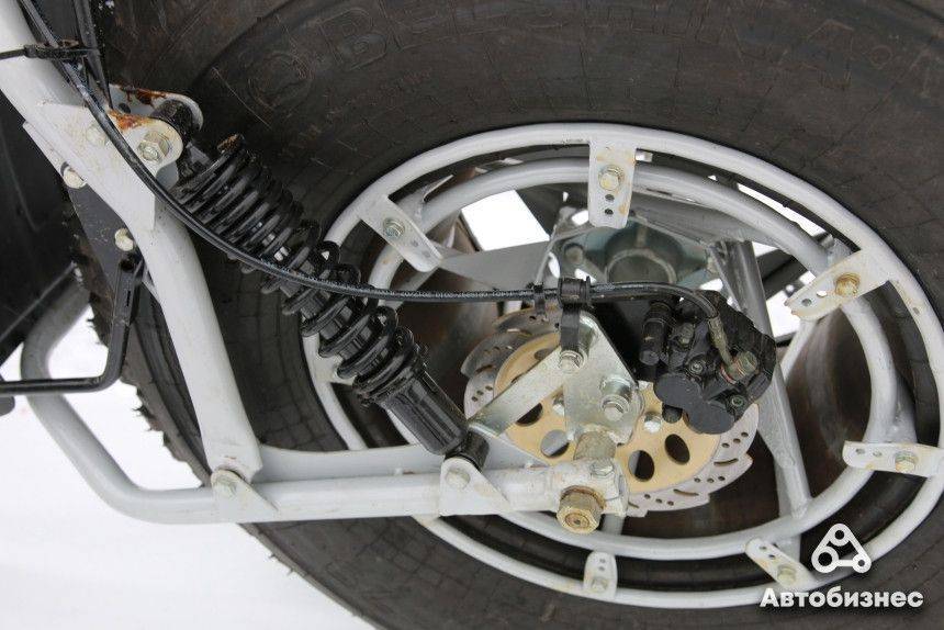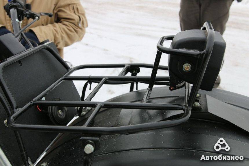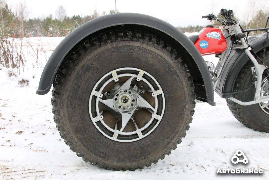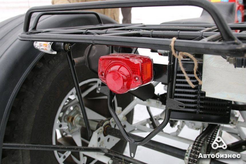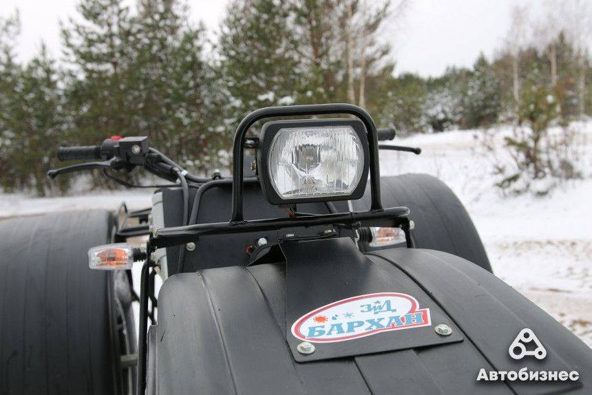 Садимся. От мотоцикла у «Бархана» помимо мотора — руль со всеми соответствующими органами управления, ножное переключение пяти передач, кик- и элекстростартер, краник резерва топлива, цепной привод задних колес, правда, цепь двухрядная. От внедорожного автомобиля — редуктор с понижающей и задней передачами, а также стояночный тормоз.