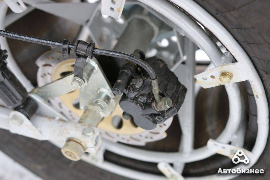 Для снижения скорости предусмотрен дисковый тормоз с гидравлическим приводом, усилие регулируется с помощью рычага на руле.
