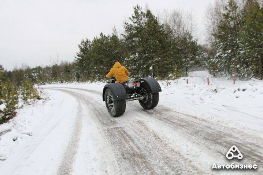 Трицикл устойчив и на нем спокойно можно покататься по бездорожью. Надев цепи на задние колеса проходимость повышается.