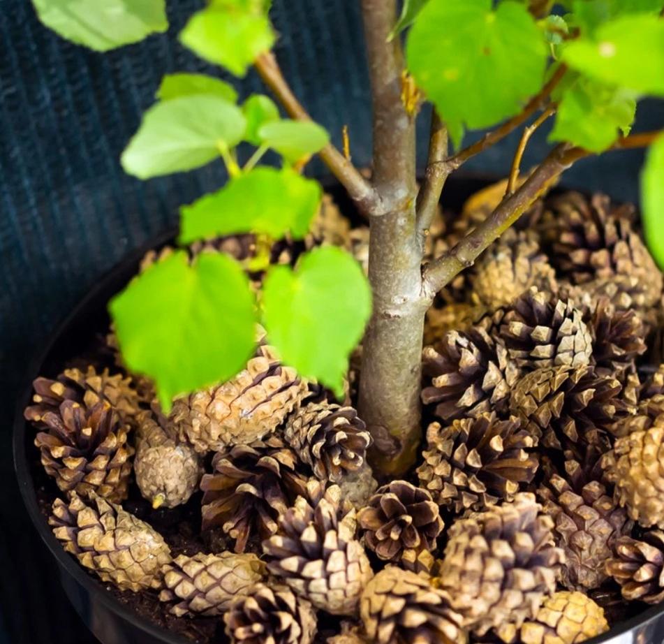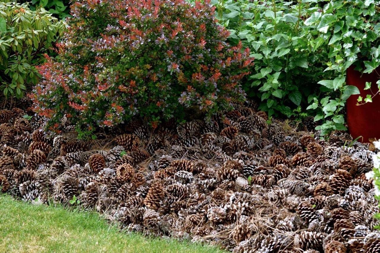 Мульча из шишек выглядит декоративно и приносит растениям огромную пользу. Чаще всего их используют для мульчирования приствольных кругов деревьев и кустарников. Мелкие шишки выкладывают целиком, крупные экземпляры измельчают в щепу.