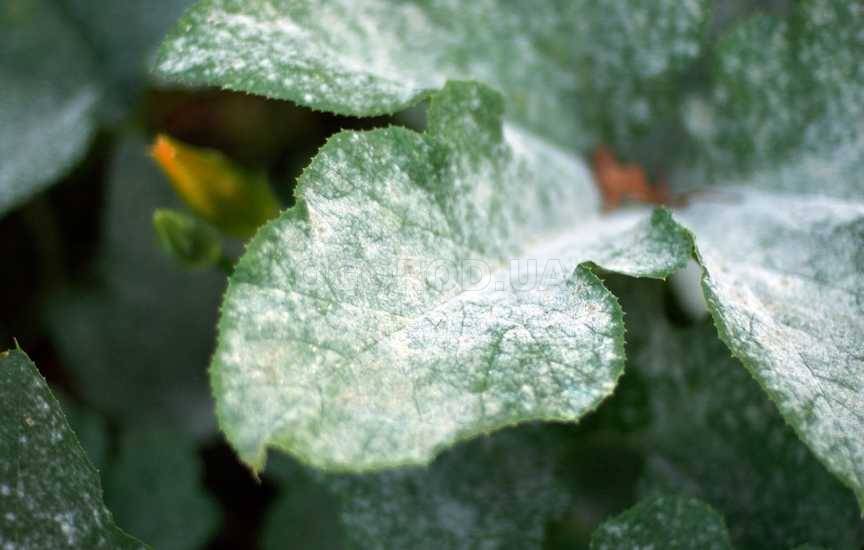 Основной признак недуга – белый налет на листьях кабачков. Это грибок, который лишает растение питательных веществ и тем самым приводит к гибели (листья скручиваются и высыхают).