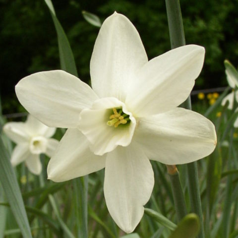Белые цветки с сильным ароматом, со слегка отогнутыми «лепестками» и небольшой, зеленоватой внутри коронкой с красным краем. Этот нарцисс зацветает позже большинства других – в конце мая. Наиболее распространенный в России ботанический нарцисс, который также относят в классу Поэтических. Недостаток влаги в начале лета может привести к ослабленному цветению на следующий год. Есть старинная махровая форма, которая цветет в начале июня (“Double Pheasant Eye”). Элементы коронки не выражены, весть цветок состоит из множества белых листочков околоцветника. Высота – 36 см.
