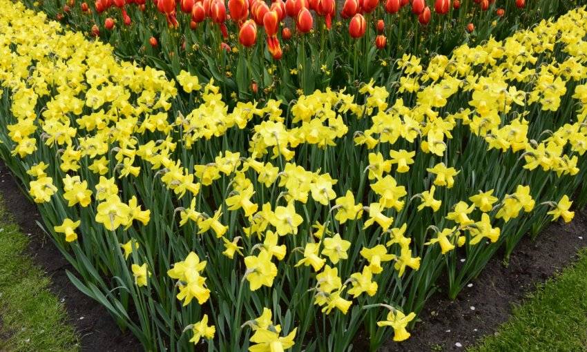 Нарциссы традиционно высаживают в миксбордере. В этой композиции цветки занимают место на переднем плане. По соседству должны быть посажены культуры с густой листвой, которые прикроют нарциссы, когда те начнут увядать.