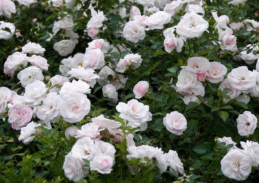 Компактная обильно-цветущая роза из Германии. Куст высотой 70 — 80 см, густой, подходит для контейнерного выращивания и как почвопокровник. На открытом участке сильно разрастается в ширину. Листья мелкие, темно-зеленые, создают эффектный фон для соцветий. Цветок махровый, чашеобразный, диаметром 5 — 6 см, в полуроспуске имеет розоватый оттенок (интенсивнее в прохладную погоду и в тени), при полном раскрытии становится зефирно-белоснежным. На одном побеге закладывается от 5 до 10 — 15 бутонов. Аромат слабый, едва ощутимый. Отцветшие цветки быстро сбрасывают лепестки, не «засоряя» куст. Цветение непрерывное и обильное. Сорт отличается хорошим иммунитетом и устойчивостью к неблагоприятным факторам среды.