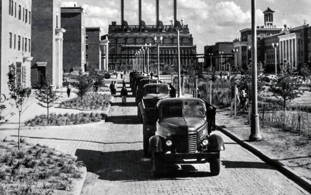 Новенькие грузовики Jiefang CA-10 двигаются по главной улице завода