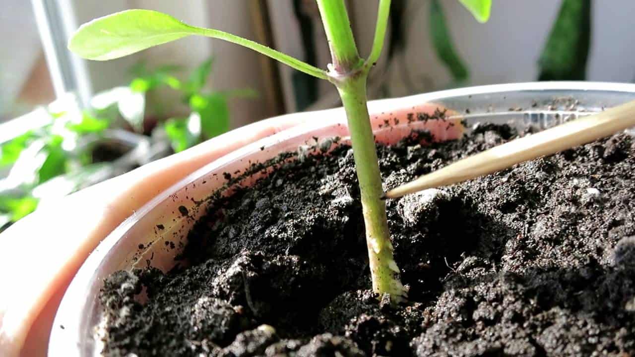 - У растения есть корневая шейка (разграничение между тканями корня и стебля). Если при высадке рассады или окучивании молодых кустиков сильно заглубить шейку, может наблюдаться угнетение, а иногда и полная остановка роста перца, загнивание корешков или развитие болезней.