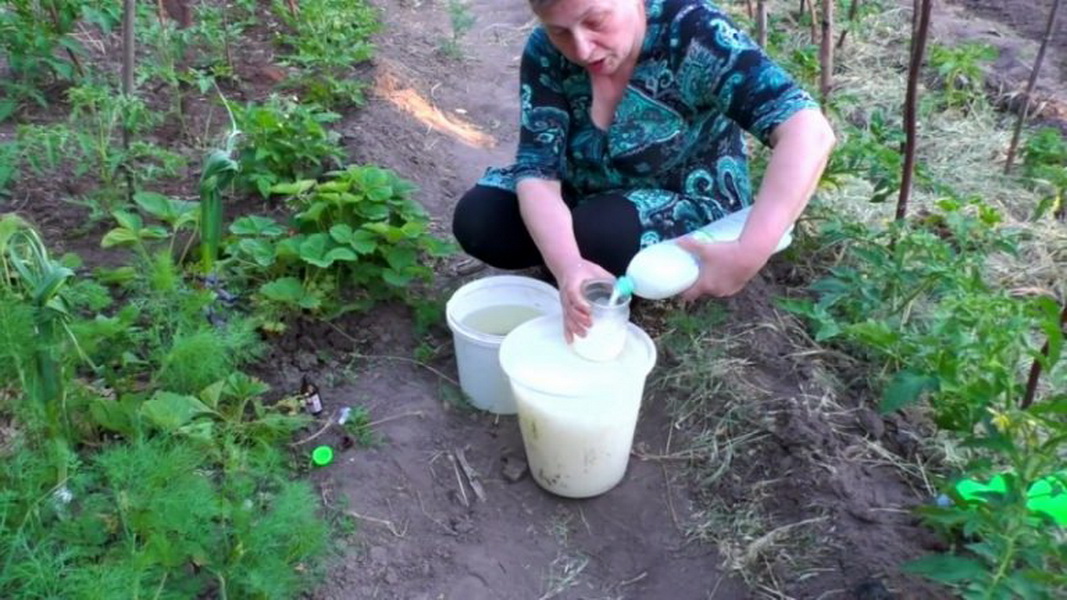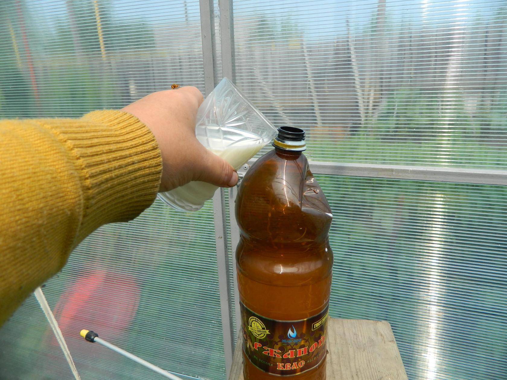 Для профилактической обработки с заболеваниями можно приготовить раствор из 1 литра жидкости и 2 стаканов кисломолочного продукта. Опрыскивать по листьям еженедельно.