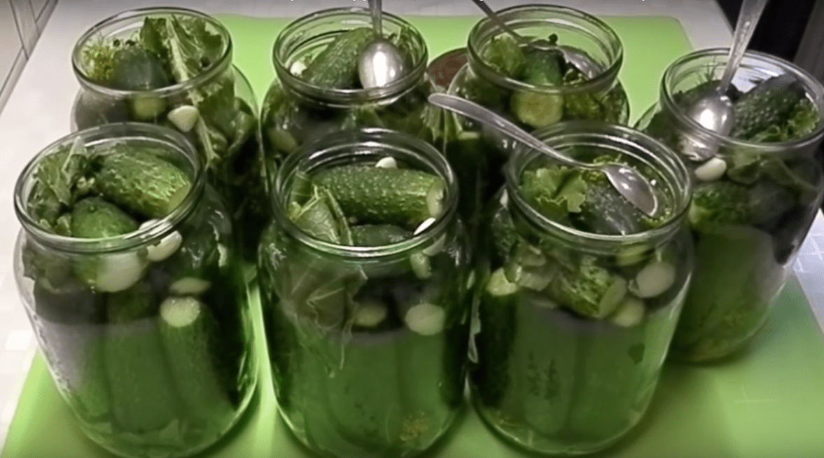 Перед тем как заливать овощи маринадом, их дважды заливают простым кипятком, который сливается из банки через 10-15 минут. Пряности и специи кладут на дно банки перед помещением в нее огурцов. Традиционно используют листья хрена, вишни, смородины, укроп, перец горошком.