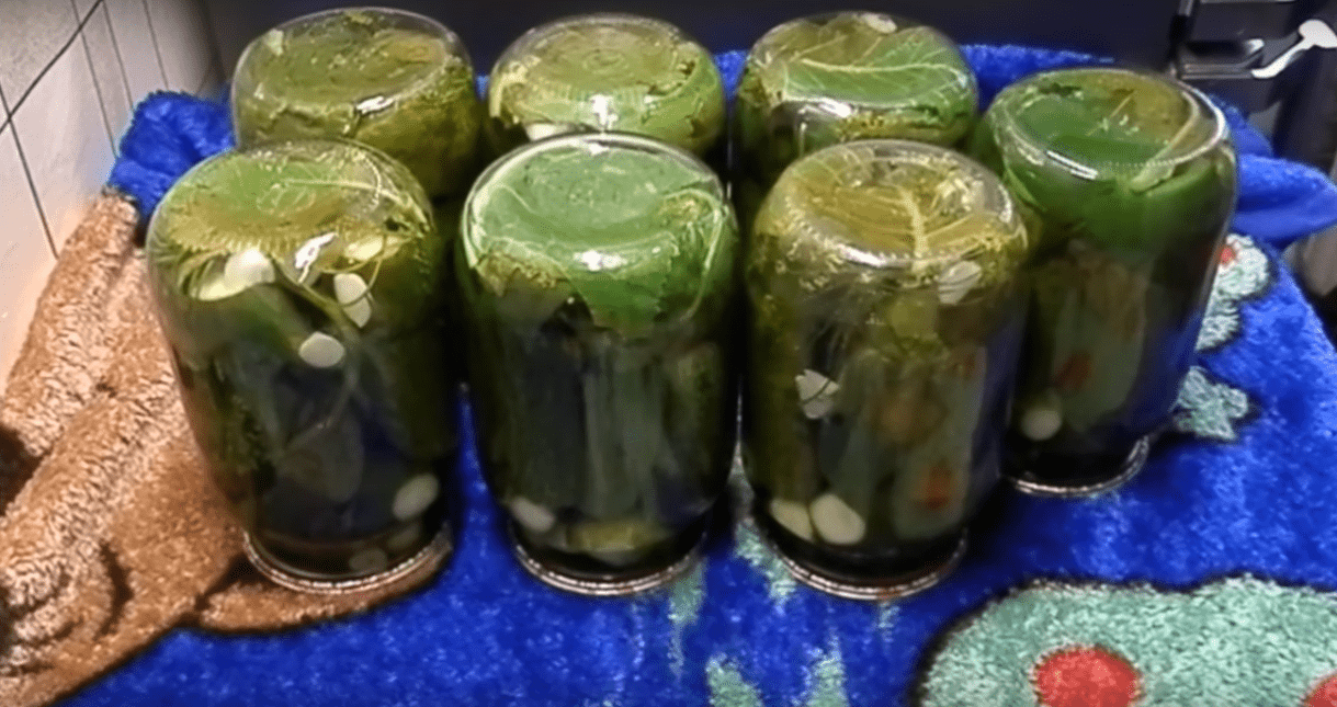 Затем банки с огурцами вынимаем и герметично укупориваем. Переворачиваем банки вверх дном и оставляем так до полного остывания.