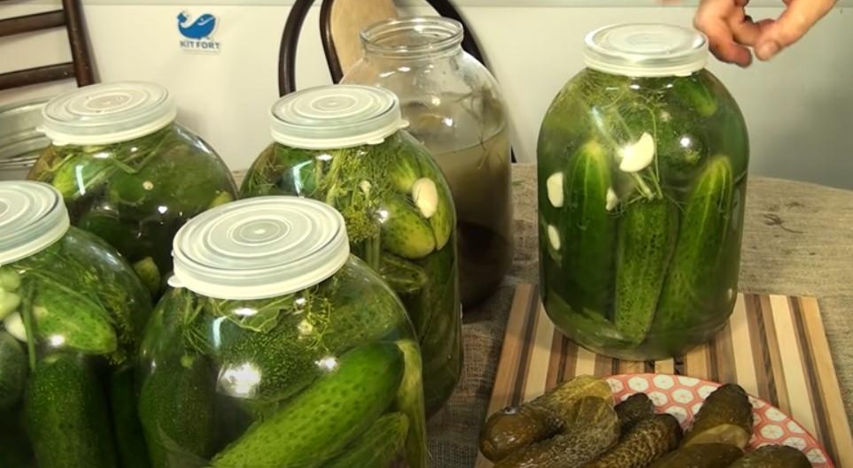 - Водку слегка разбавляют и вливают в бутыль, затем по самый срез горлышка вливают холодную воду. Засол и хранение огурцов по этому рецепту рассчитан на прохладное помещение, банки накрывают пластиковыми крышками.
