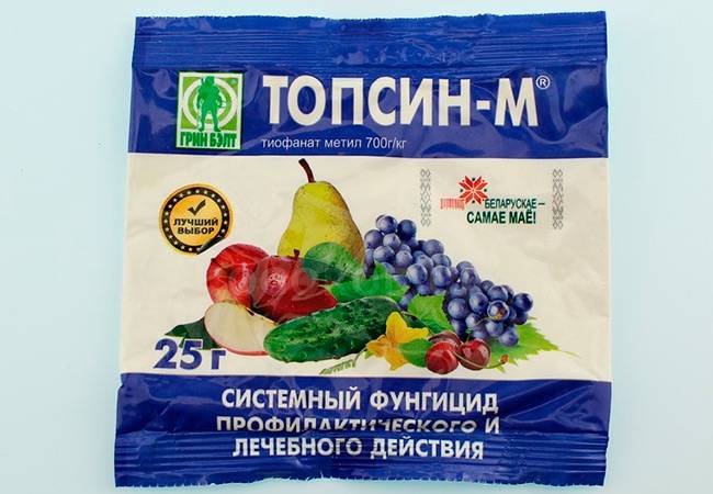 | «Топсин М» | Выпускается в виде водорастворимого порошка. Системный препарат против целой группы грибковых инфекций. Соединяет в себе свойство фунгицида и инсектицида. Блокирует рост мицелия и спорообразование грибка в течение суток после обработки. Токсичен для почвенных нематод. |