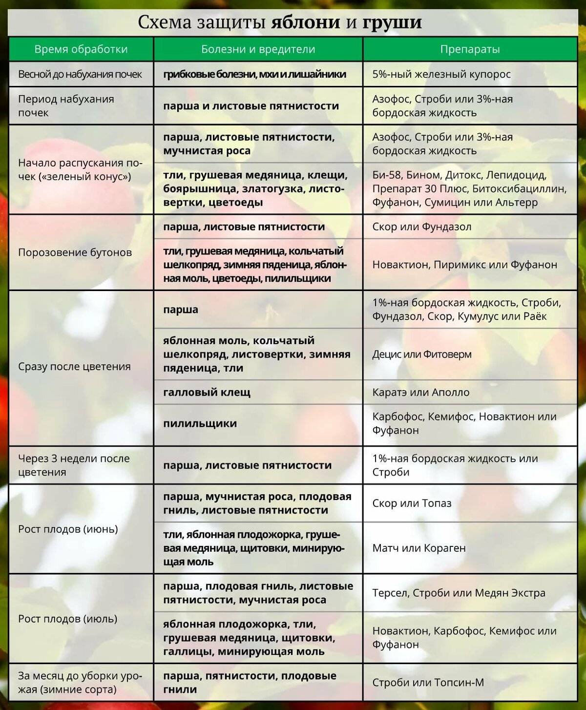 Химические препараты наиболее эффективны, однако требуется системный подход в их применении. Бесконтрольное использование фунгицидов чревато: у деревьев снижается иммунитет и появляются другие болезни, а плоды насыщаются нитратами. Среди химических веществ, помогающих бороться с паршой на грушах, наиболее эффективны: