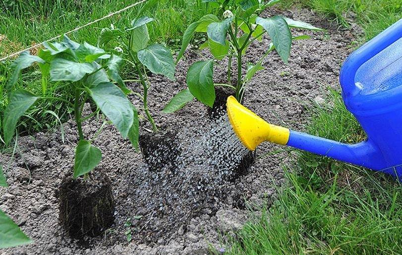 Часто поливать перцы не рекомендуется. Первый полив проводят теплой водой через 7 дней после пересадки в грунт. В дальнейшем поливают растения один раз в неделю, по 5 литров воды на один куст. В жаркую погоду, можно поливать чаще – один раз в 3-4 дня. Если почва вокруг растений не замульчирована, рекомендуется следить за тем, чтобы корешки не оголялись. Если после полива видны корешки, то растения следует слегка окучить.