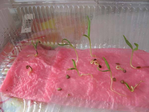 - во время проращивания поддерживают влажность, своевременно подливая теплую воду.