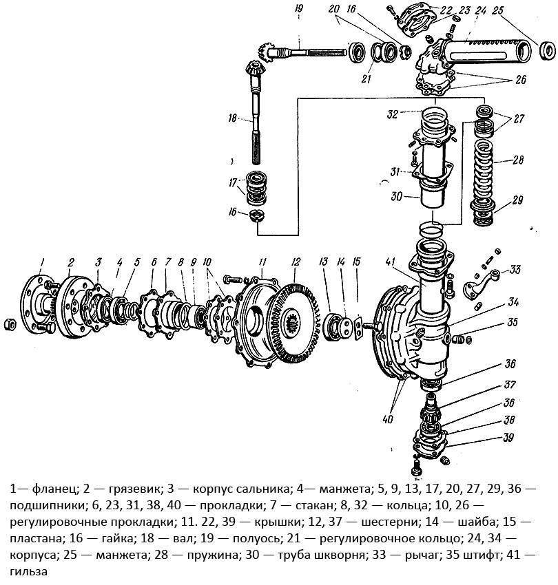 - Главная передача регулируется аналогично с портальным мостом. Натяг в подшипниках настраивается затяжкой гайки хвостовика ведущей шестерни и регулировочными шайбами. Боковой зазор в зацеплении шестерён главной передачи должен составлять 0,18… 0,46 мм. Регулируется прокладками между фланцем стакана ведущей шестерни и корпусом моста, а также между левым и правым рукавами и корпусом моста. Правильность регулировки проверяется моментом сопротивления проворачиванию шестернёй, который должен быть в пределах 0,12…0,18 кгс (1,2…1,8 Н.м)