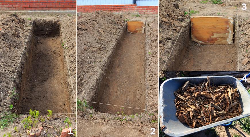 2. Утеплите северную стенку траншеи досками. Это необязательно, но с ними как-то спокойнее (3).
