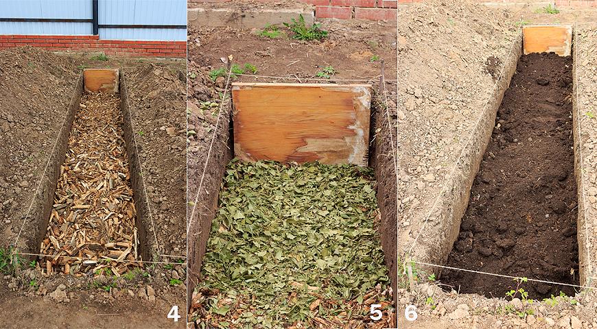 3-й слой (10 см): навоз, можно не совсем перепревший (я использовал конский), он также за 6–7 месяцев дойдет до нужного состояния (6).