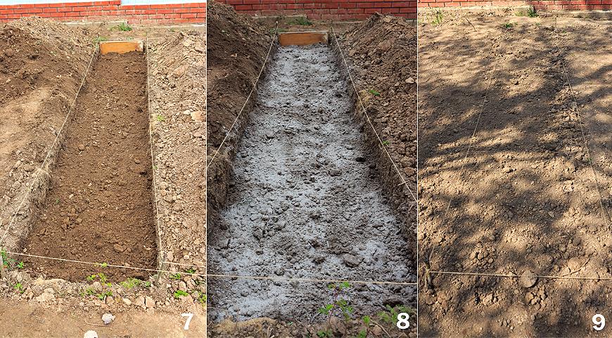 6-й слой: садовый или универсальный грунт, досыпаю траншею до уровня почвы (9).