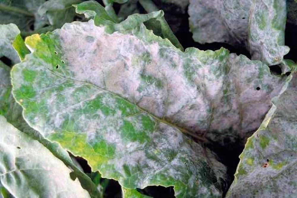 Эта болезнь является опасным «дополнением» к предыдущему – то, что не уничтожает церкоспороз, поражает ложная мучнистая роса (пероноспороз), поскольку ее возбудитель предпочитает молодые центральные листья. Признаком этой грибковой инфекции будет ботва с загнутыми вниз и уплотненными листьями, которые приобретают более светлую окраску, а со временем желтеют и засыхают или загнивают в зависимости от уровня влажности. В дождливые периоды снизу листвы появляется серо-фиолетовый налет.