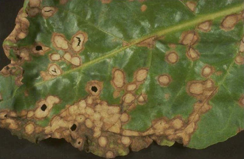 По симптомам этот грибок похож на проявления церкоспороза, но появляющиеся на взрослой ботве пятна сначала имеют серо-зеленоватую окраску, а со временем разрастаются и становятся грязно-белыми. При повышенной влажности почвы и воздуха они покрываются налетом такого же цвета. В засушливые периоды на листовых пластинах образуются мелкие отверстия, они растрескиваются и опадают.