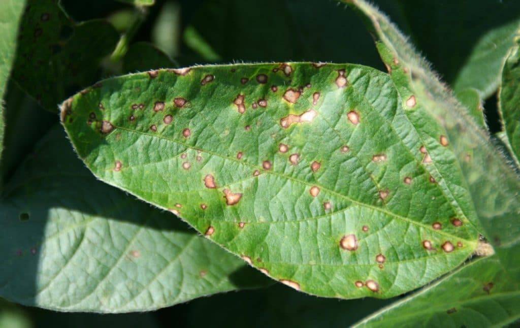 Листья поражают светлые пятна диаметром 0,2-0,5 см с красной каймой. К осени они мельчают, превращаются в черные точки, в итоге нижняя ботва отмирает.