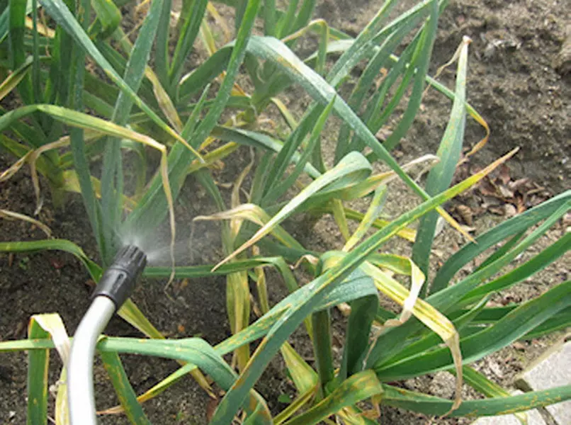 - Молодые всходы чеснока орошают однопроцентной бордосской жидкостью.