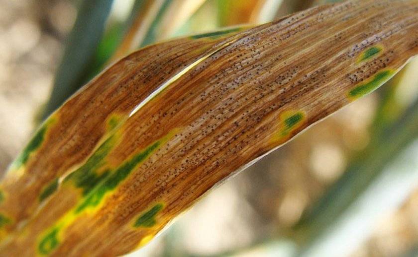 - Ботритиоз развивается при устойчивой сырой и прохладной погоде. Симптомом этого грибкового заболевания являются бурые пятна на листьях и характерная водянистая пятнистость луковицы, переходящая на стеблевую часть. Это приводит к гниению растения и клубнелуковицы. Для профилактики растения опрыскивают бордосской жидкостью или медным купоросом, а луковицы перед закладкой на хранение обрабатывают препаратами Максим и Фундазол.
