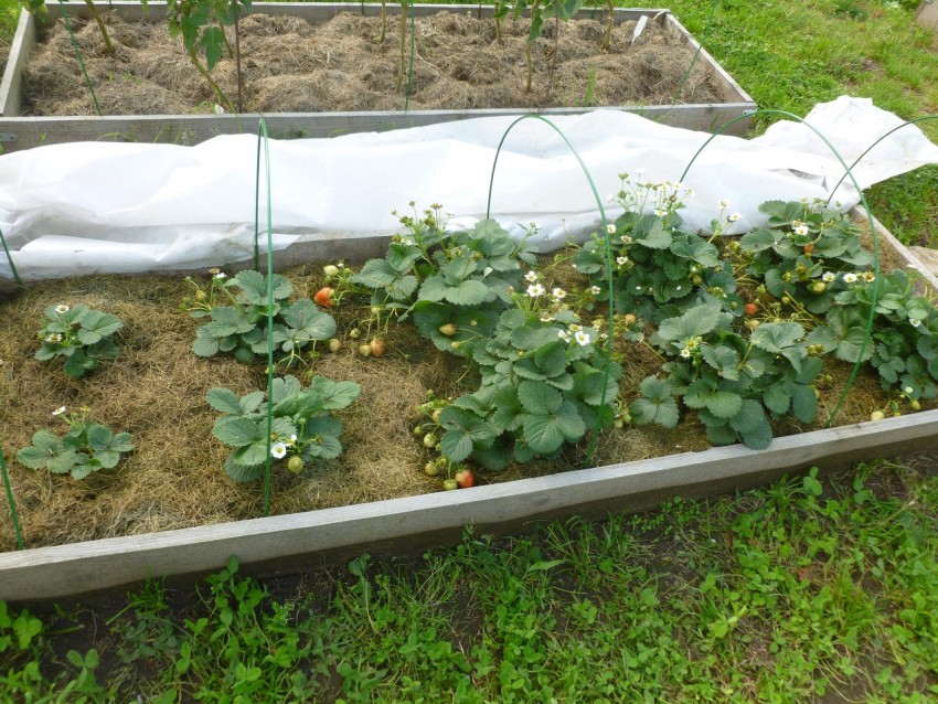 На грядках клубники (прошлого года) нет или почти нет цветов.