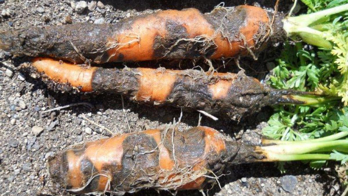 Молодые растения погибают сразу, при позднем заражении корнеплоды успевают сформироваться, но на корешках и кончиках имеются темные пятна, где быстро идет разложение тканей до водянистой кашицы. Одна такая морковь создает вокруг себя обширный очаг гниения с резким неприятным запахом.