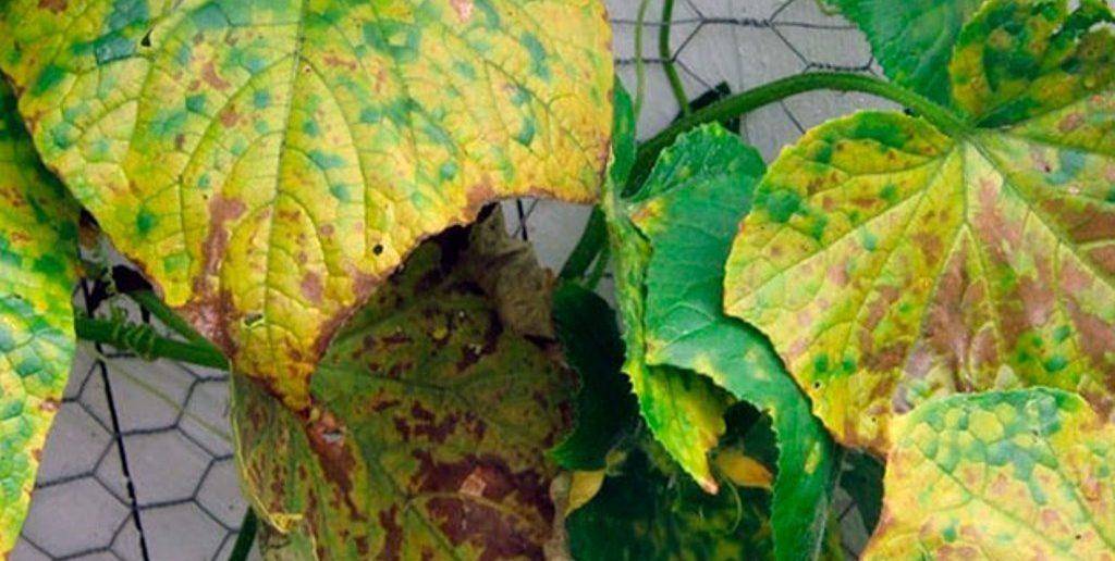 Зелёная мозаика: на листе образуются хаотичные жёлтые и светло-зелёные пятна. Края листа загибаются вниз, пластина становится морщинистой. То же самое происходит и с плодами. Они покрываются пятнами и сморщиваются.