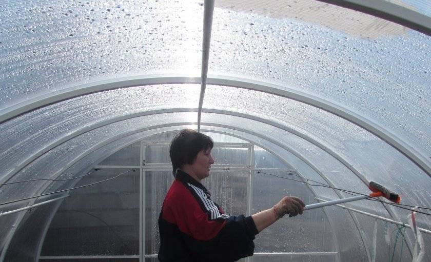 При культивации огурцов в теплицах нужно тщательно подходить не только к подготовке почвы, но и к самой конструкции. Вне зависимости от того, переносная теплица стоит на участке или стационарная, стены помещения необходимо обеззараживать. Обработке подлежат профили, поликарбонат/плёнка. Снаружи конструкцию моют с хлорсодержащими веществами. Можно воспользоваться обычной белизной. Её разводят с водой в пропорции 1:10.