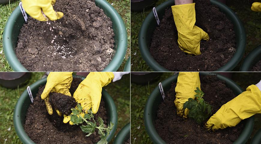 Перед посадкой в грунт добавьте универсальное минеральное удобрение для овощных культур. Тщательно его перемешайте и высадите томаты с небольшим заглублением.